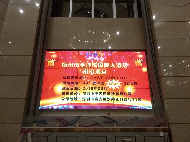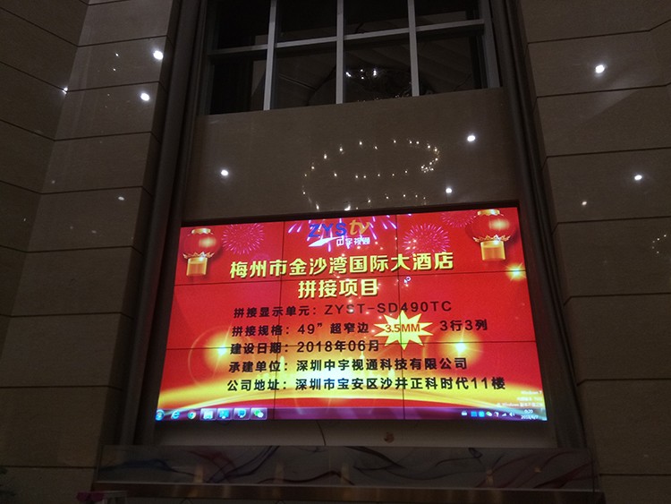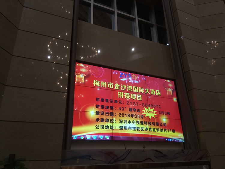 梅州市金沙灣國際大酒店選用中宇視通科技49寸3.5mm拼縫液晶拼接屏,項(xiàng)目安裝調(diào)試完成并且順利通過驗(yàn)收。