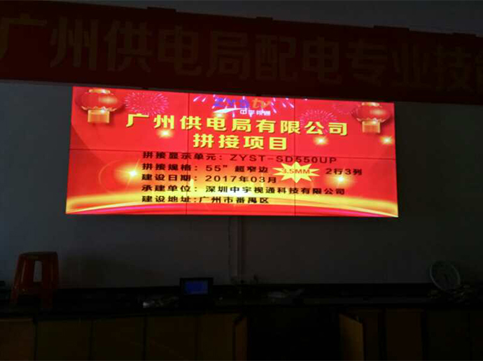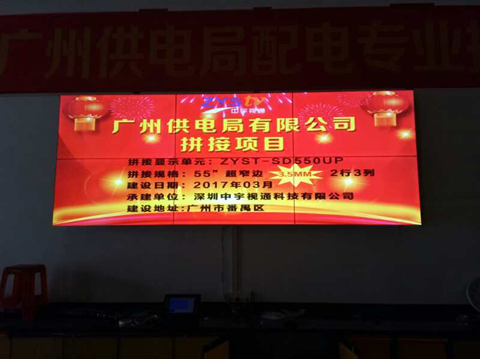 拼接項目:廣州市供電局拼接單元:ZYST-SD550UP拼接拼縫:3.5mm拼接規(guī)格:2*3拼接尺寸:55寸拼接屏安裝方式:壁掛承建地址:廣州市番禺區(qū)供電局承建日期:2017年3月承建單位:深圳中宇視通科技有限公司