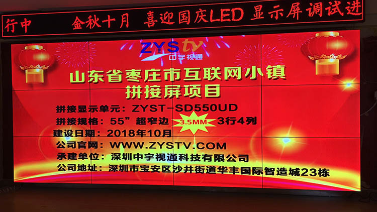 山東棗莊市互聯(lián)網(wǎng)小鎮(zhèn)55寸超窄邊3.5mm3行4列液晶拼接屏項目,安裝調(diào)試完成并且順利驗收,中宇視通科技全體職工從深圳發(fā)來賀電!