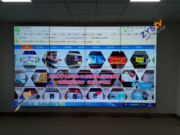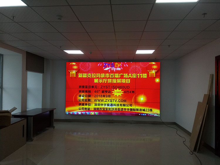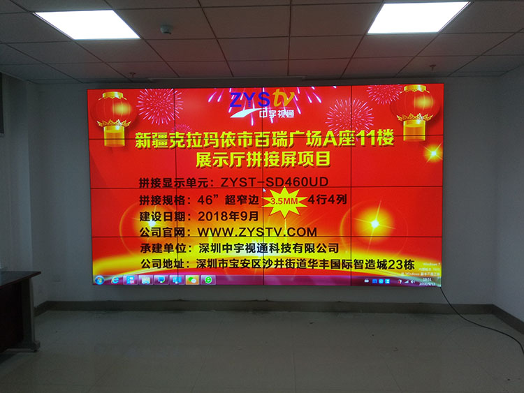 新疆克拉瑪依市百瑞廣場A座11樓展示廳46寸拼縫3.5mm超窄邊拼接屏項(xiàng)目,安裝調(diào)試完成并順利通過驗(yàn)收,中宇視通全體同事從深圳發(fā)來賀電!
