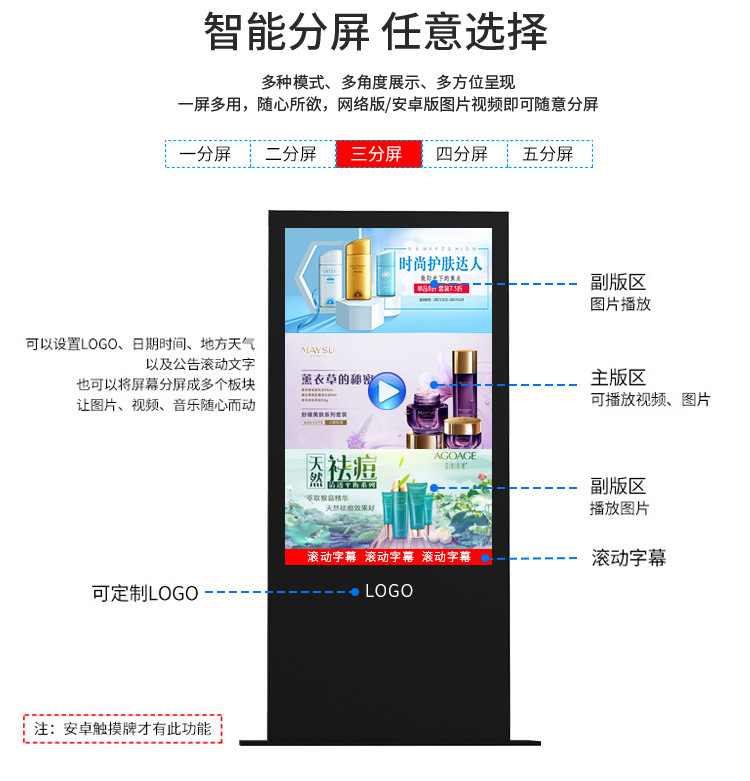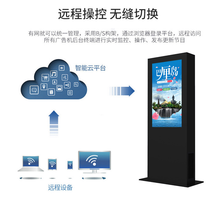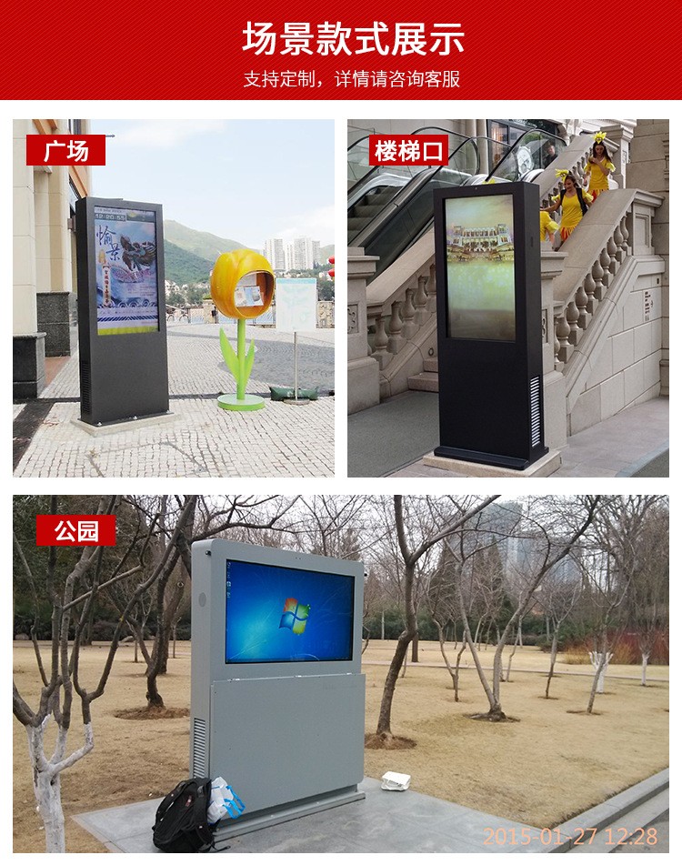 戶外立式廣告機(jī)適用于旅游景區(qū)、公園、廣告?zhèn)髅健⑸鐓^(qū)、公交站臺(tái)、高速收費(fèi)站、政府機(jī)關(guān)、校園等戶外場(chǎng)合使用,我們的戶外廣告機(jī)支持定制外觀、硬件、接口等,廠家直銷,價(jià)格優(yōu)惠,歡迎來電咨詢:18566661105